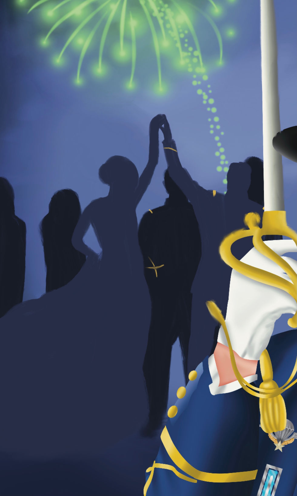 Pour l'année 2023, j'ai eu la chance d'illustrer l'affiche officielle de la Promotion pour leur Bal du Triomphe. La couleur bleue est prédominante dans ce projet, couleur phare du Grand Uniforme des élèves de l'EMIA. Les silhouettes en fond, représentant la foule, sont dessinés dans des tons bleutés rappelant l'uniforme, avec les insignes dorées ressortant de ce bleu. Un soin particulier a été apporté à l'insigne de l'école, les médailles, ainsi que le Brevet - ici Para.